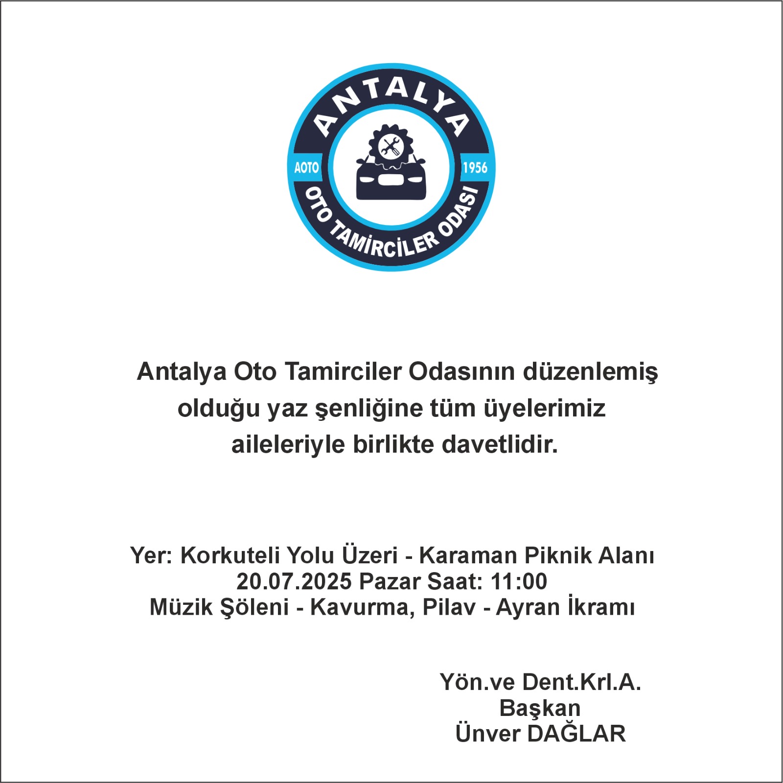 Oto Tamirciler Odası olarak ,20 Temmuz pazar günü Karaman Piknik alanında , saat 11.00 da düzenleyeceğimiz yaz şenliğine tüm üyelerimiz aileleriyle birlikte davetlidir. Katılımlarınız bizleri onurlandıracaktır.